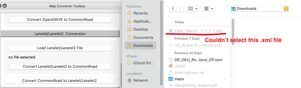 I wanted to convert an opendrive map to lanelet2 using your tool, thus I firstly convert opendrive to commonroad(obtained one .xml file first), and then tried to convert this .xml commonroad file to lanelet2. However, in the 2.step(from commonroad to lanelet2), I couldn’t select commonroad file in the toolbox window and it seems that only lanelet format is allowed to be selected, see below for more details.