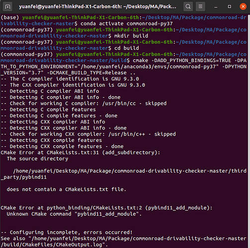 I’m trying to compile the CommonRoad Drivability Checker with command: cmake -DADD_PYTHON_BINDINGS=TRUE -DPATH_TO_PYTHON_ENVIRONMENT="/home/yuanfei/anaconda3/envs/commonroad-py37" -DPYTHON_VERSION=“3.7” -DCMAKE_BUILD_TYPE=Release, but the following error occurs: