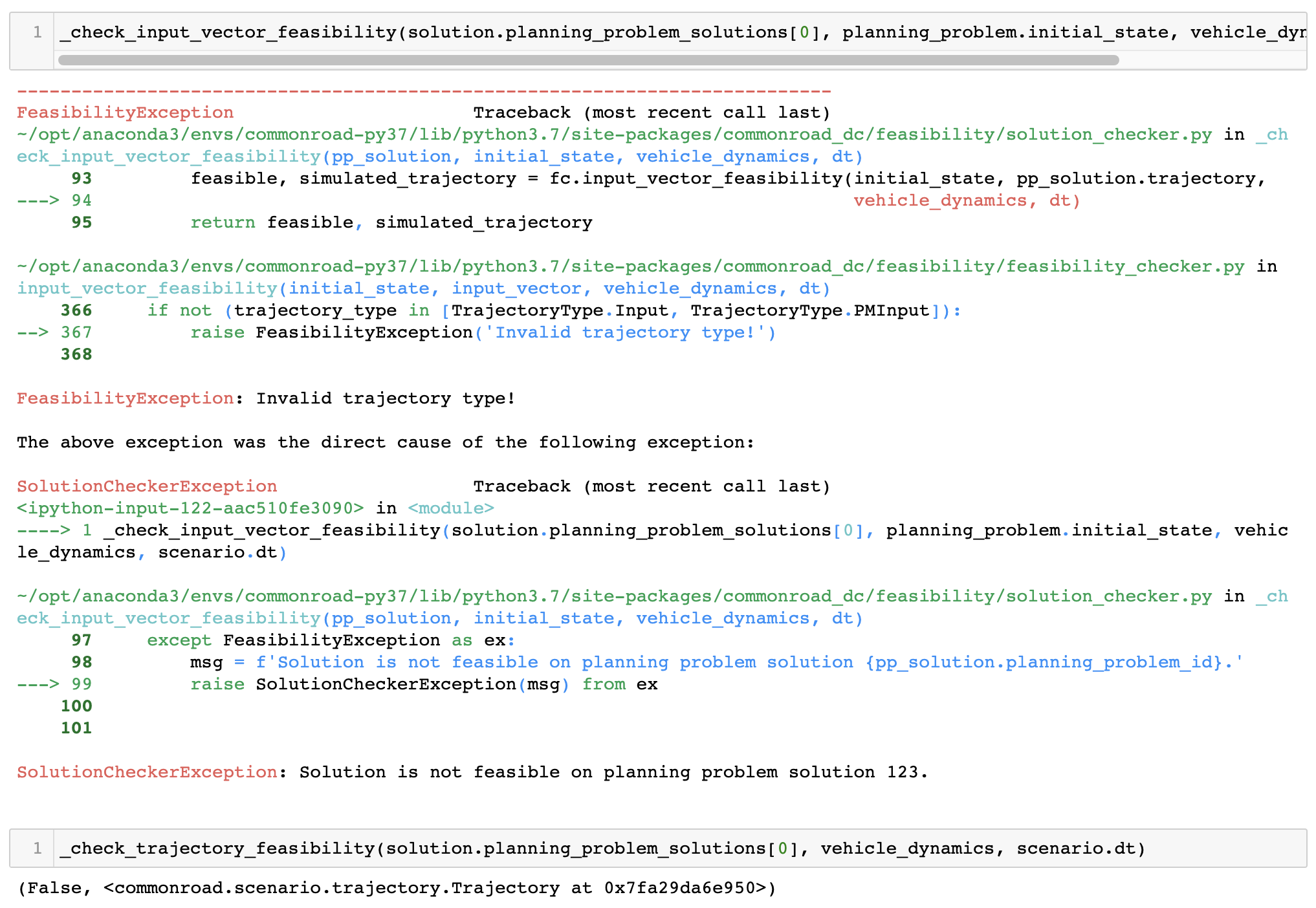 ich checked the solution via solution checker, it has passed but there seems to be a problem with detecting my trajectory through the other function solution_feasible (which includes _check_input_vector_feasibility and _check_trajectory_feasibility), could you give me some suggestions?