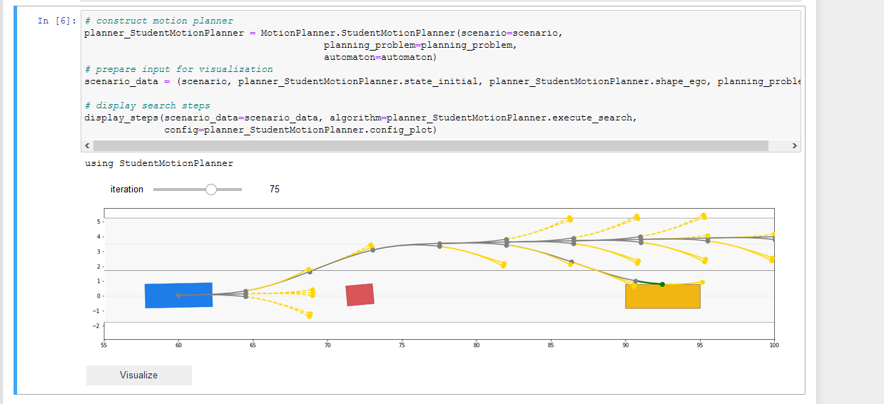 In my experience on running the scenarios, if found it pretty hard to tune all the parameters and functions heuristics in the search algorithm. Especially to understand why it takes sometimes pretty long, until a valid solution is found or why none is found. I ended up tuning a lot of functions “based on my own experience” of driving in a car (e.g. a good distance to other vehicles in meters etc.), because I had not enough computing power to tune this. I ended up printing the time t, and x,y coordinates for every expansion - not a great visualization, but good enough to understand that the heuristic function has problems to turn more than 90*.